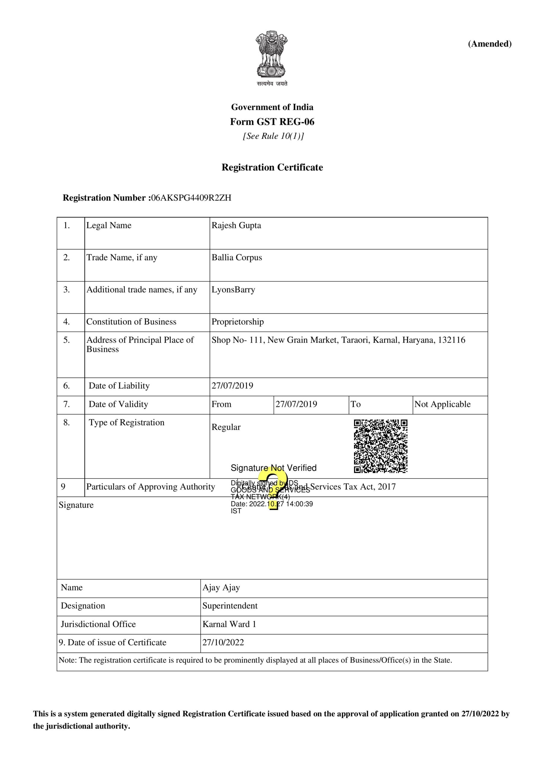 GSTIN Number: 06AKSPG4409R1ZZ